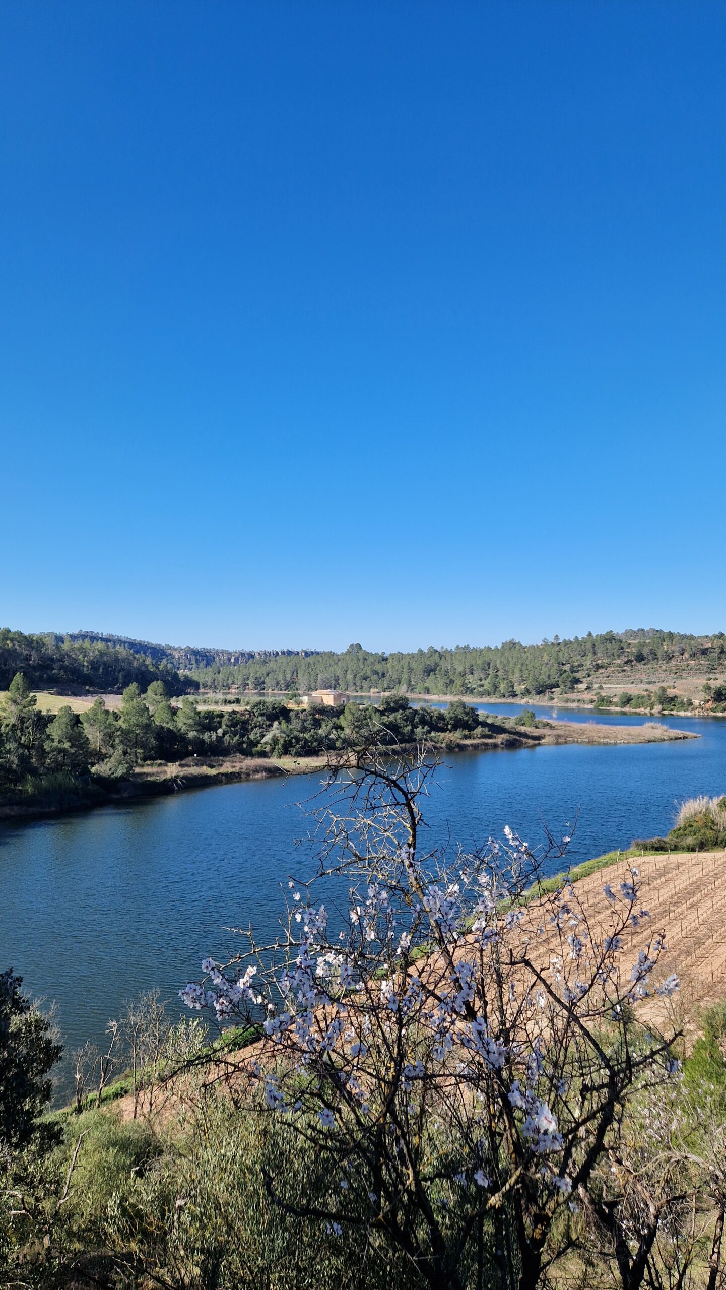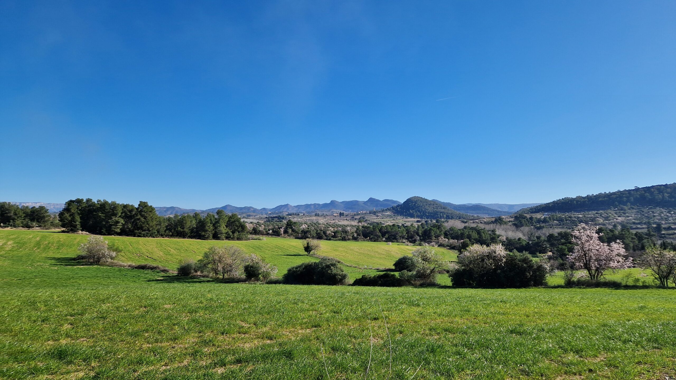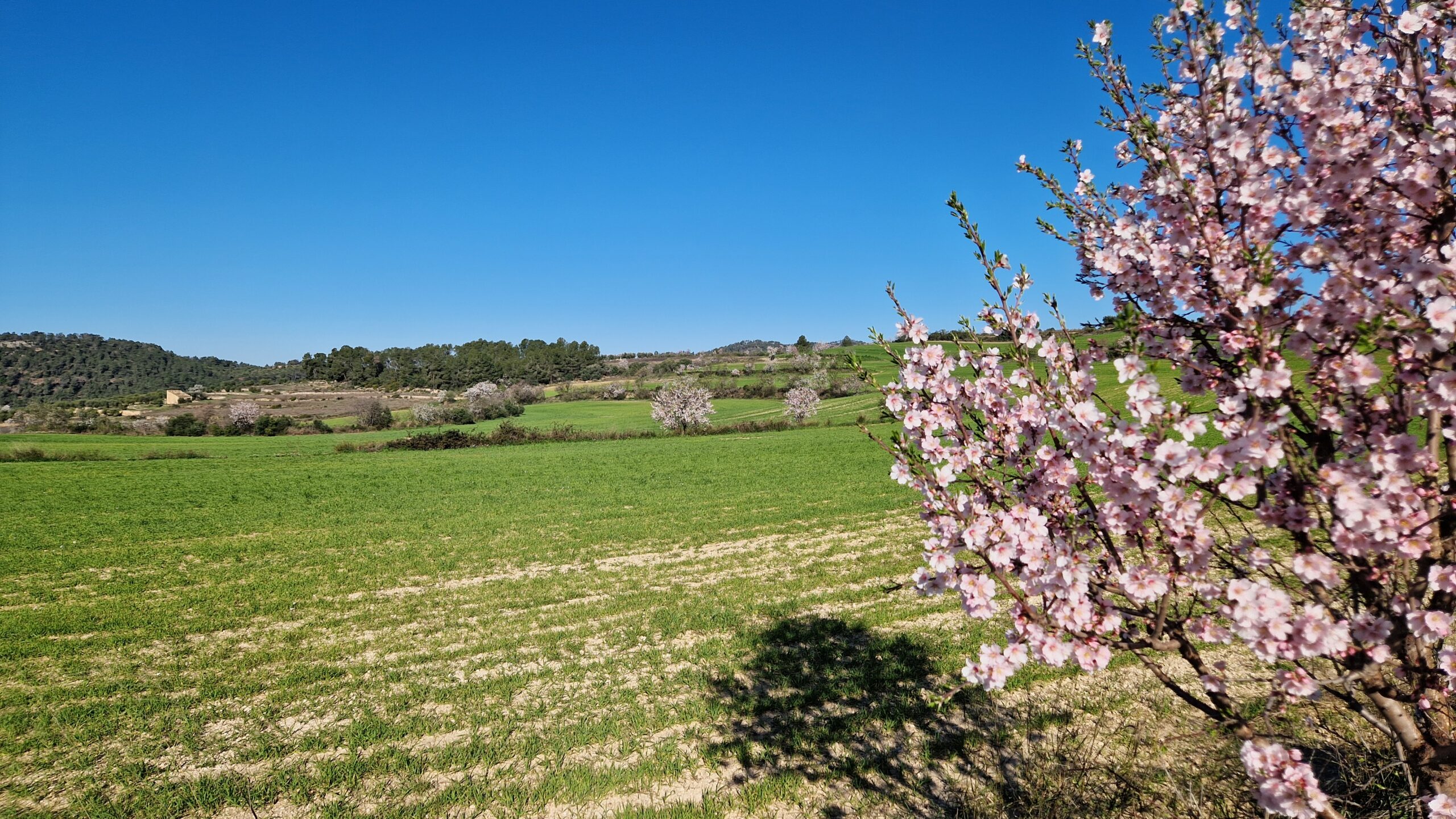 La ruta s’inicia caminant entre vinyes i camps de conreu. La pluja ha estat generosa i això es nota quan mirem el paisatge. Trobem també una pila d’ametllers florits amb roses i blancs de diferents intensitats, això encara fa més bonic tot allò l’escenari que tenim davant.